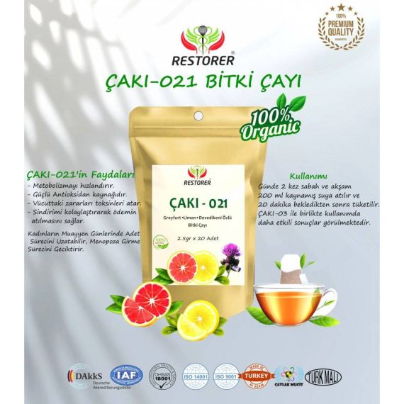 There are 20 Pieces of Teabags in 1 Package. Usage: 1 pocket knife - 021 tea is poured into 200 ml of boiled water twice a day, morning and evening. It is consumed after waiting 20 minutes. Ingredients : Dried Grapefruit , Dried Lemon , Dried Thistle , Dried Artichoke . Pregnant and gynecological patients should consult their doctor before use. Women should use it on certain days (It can prolong the menstrual period, prolong the menopause period).,