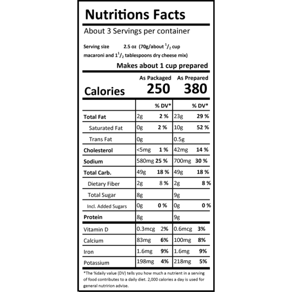 Pasta (Durum Wheat Semolina), Whey powder, wheat flour, salt, corn starch, coffee creamer [glucose syrup, hydrogenated palm oil, hydrogenated coconut oil, stabilizer (sodium citrate, potassium phosphate), milk proteins, emulsifier (mono and diglycerides), anti-caking agent (silicon dioxide), [beta]-carotene (color), flavor], natural cheddar flavor, acidity regulators (sodium poly and orto phosphate, trisodium citrate), sugar powder, milk protein, acidity regulator (citric acid), colourings ([beta]-carotene, anatto).