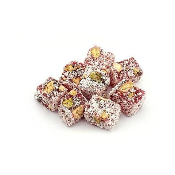 PRODUCT QUANTITY: 500 gr PRODUCT DETAILS: Ingredients: Sugar, water, starch, coconut, powdered sugar, citric acid, pistachio, nature-identical pomegranate flavor, colorant