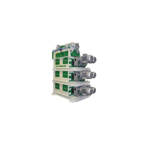 ALTINBİLEK Roller Mills ensure that the grains are milled in the desired particle size at every point in a perfect balance. High temperature increases do not occur during grinding in roller mills and an air filtration system is not required. Since their energy consumption is less than other crushing methods, operating unit costs in milling are also low. In Altınbilek Roller Mills, an electro-pneumatically controlled cover system is used in order to control the input of raw materials into the system and prevent accumulation on the rolls. There is also an electro-pneumatic controlled by-pass flap system within this section. Thanks to the by-pass system, if deemed necessary, raw materials or prepared rations can be passed through the roller mill without breaking. There is a gearmotor driven drum type feeding system at the entrance. The feeder is used to ensure a balanced distribution of incoming raw materials or rations on the roll and to control the input flow of the raw material. In the feeder section, there is a magnetic separation system with high attraction power that allows the metals that may come in the raw material to be hold. The goods entrance opening can be adjusted in the feeder. In order to ensure that raw materials or rations are grinded in desired sizes using minimum energy, special tooth structure channels are opened on the roller surfaces and the surface is subjected to hardening heat treatment. It is possible to adjust the gap between rolls to determine the capacity and particle size in the grinding process. A spring system is applied to prevent damage to the rolls and system. Gradual milling can be done to adjust the desired particle size. For this, 2- and 3-layer options are offered. Thick and fine grinding can be done respectively from the first level to the exit. There is a wide control cover on the roller mill and sampling apparatus at each level exit. Thus, the entire flow of goods, from the incoming raw material and from the ration to the product, can be observed and controlled easily. Altınbilek Roller Mills offer their operators manual and automatic roller gap adjustment options.