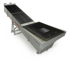 Conveyors; 500, 650, 800, 1000 and 1200 mm. It is produced as a fixed type according to the desired length, including the width. Fixed type conveyors are of two different types, from NPU profile or from bending sheet. The feeding troughs are supported by Ø89 impact rollers with hot rubber inserts...